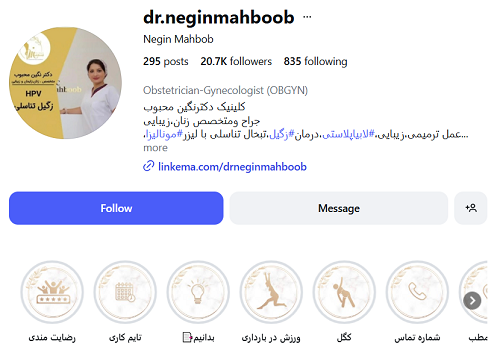 دکتر نگین محبوب، پزشک متخصص زنان، زایمان و نازایی یکی از متخصصان برجسته در حوزه پزشکی هستند. ایشان دارای دکترا حرفه ای در رشته پزشکی از دانشگاه علوم پزشکی تهران میباشند و متخصص زنان، زایمان و نازایی هستند همچنین دارای سابقه کاری طولانی و تجربه در بیمارستان های تامین اجتماعی و بیمارستان امام خمینی (ره) استان کردستان میباشند و در انجام اعمال زیبایی و ترمیمی زنان، دستگاه لیزرمونالیزا، تعیین جنسیت، درمان نازایی و IUI، مراقبت های بارداری و… مهارت دارند.